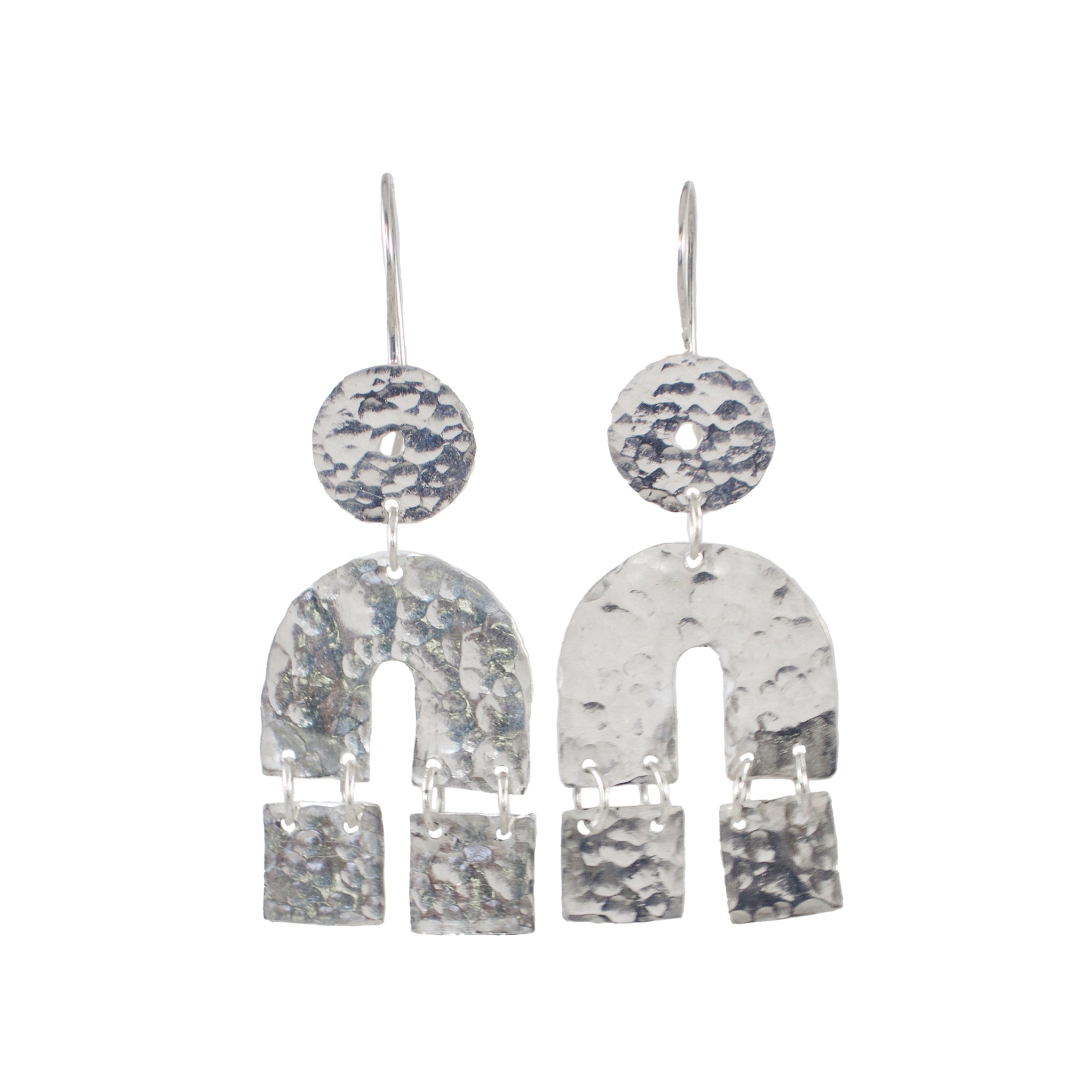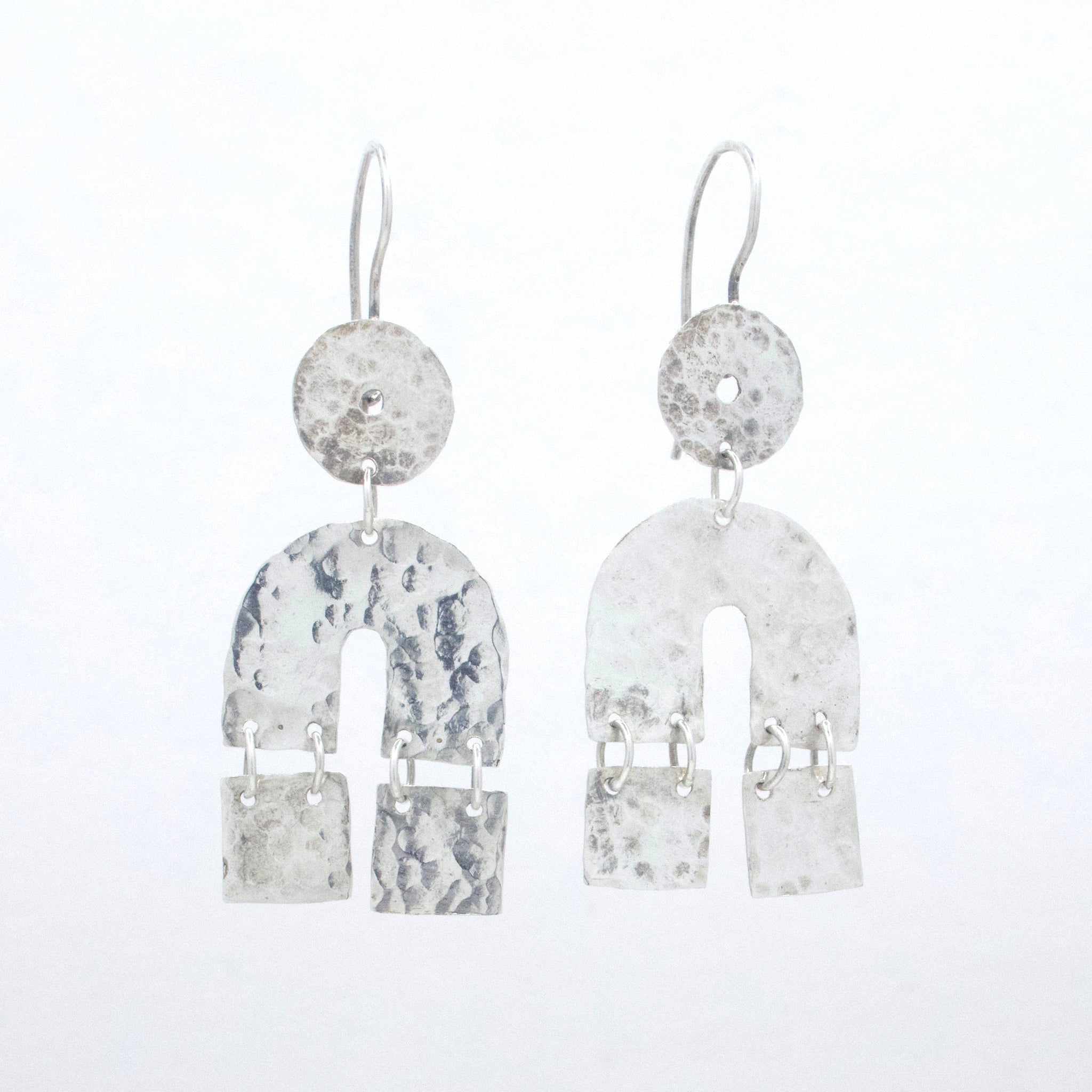 Our Atlas Earrings are made with hand textured Sterling Silver sheet, each section fitted together with jump rings the allow a little movement and shimmer. 2 1/4" long.