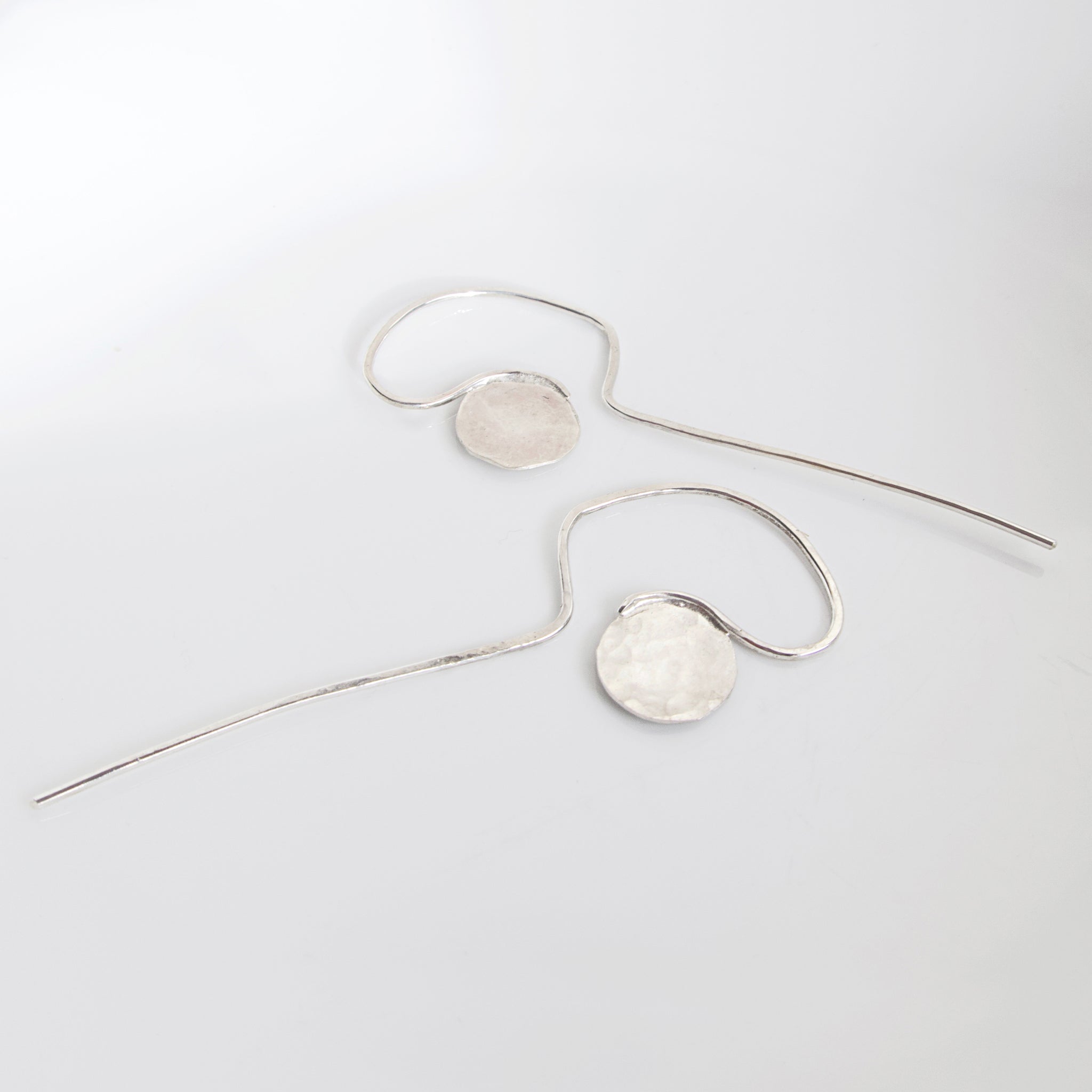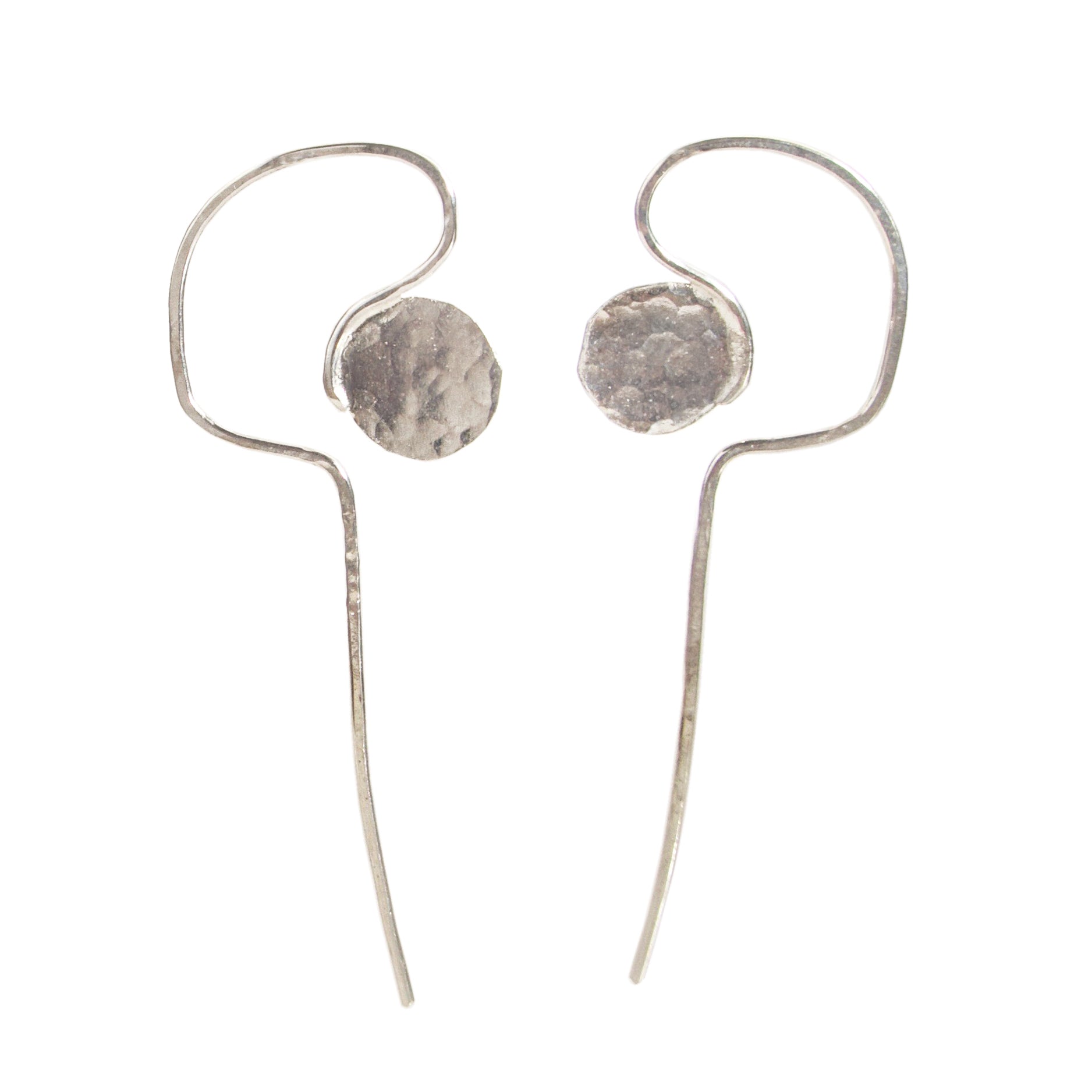 Our little Sterling Silver Perception Hoops have hand textured discs with long curving and plunging ear wires. They are just a slightly over 2" in length and face to the side.