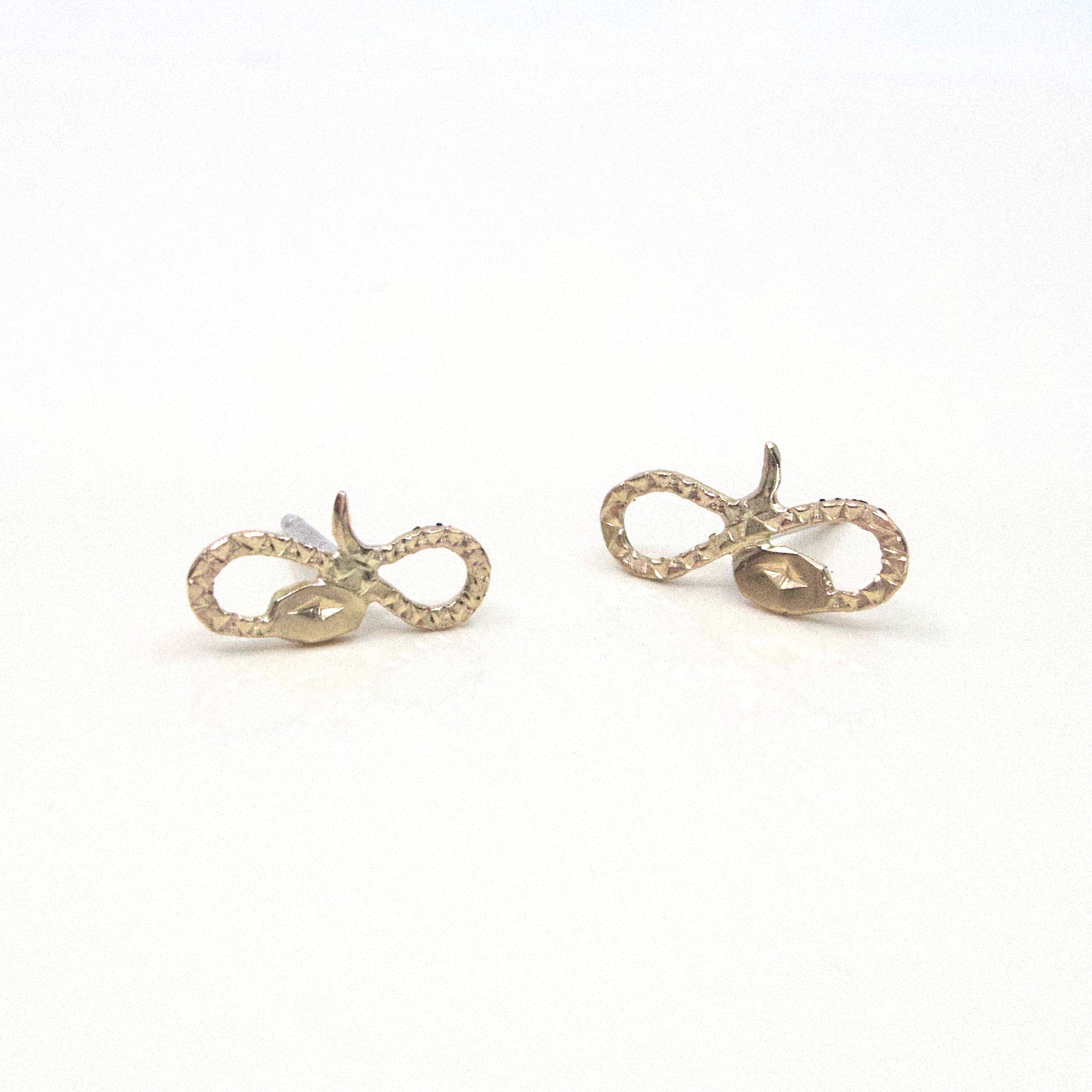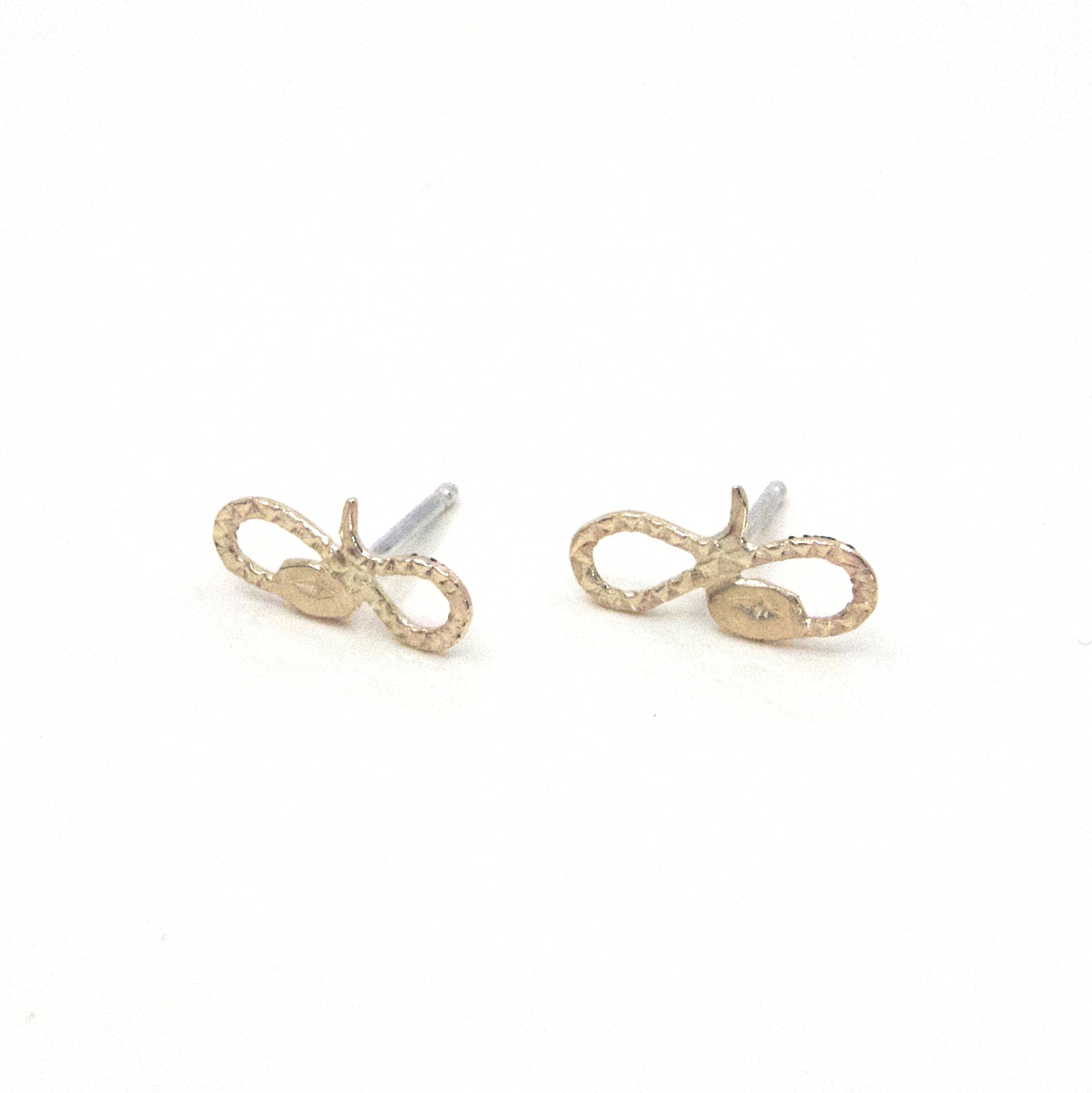 Our Infinity Viper Studs are delicate hand carved little stud earrings. About a half inch wide, each viper is formed from wire and carved by hand. Available in solid Sterling Silver or in 10K Gold with Sterling Silver post and ear nut.