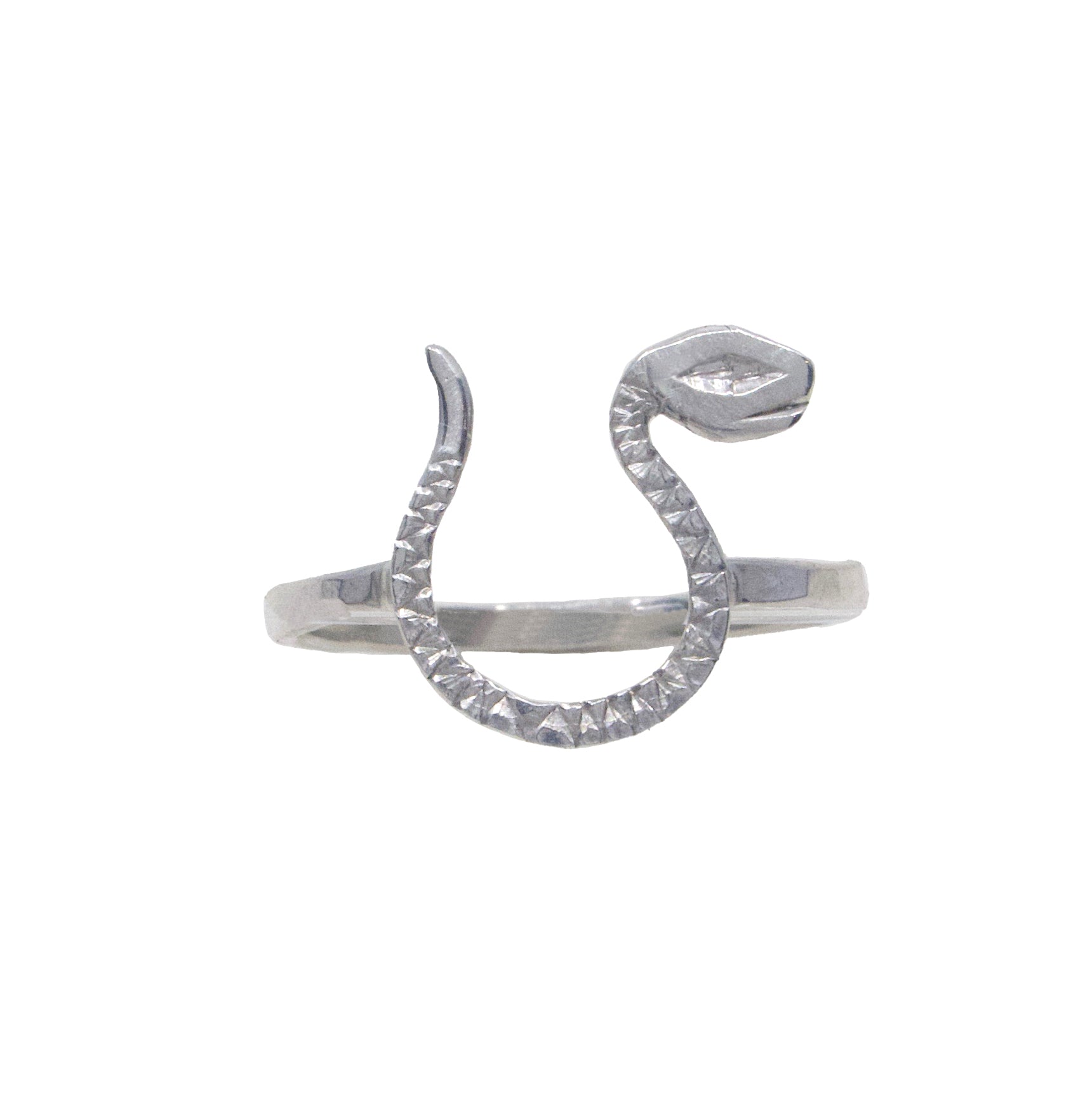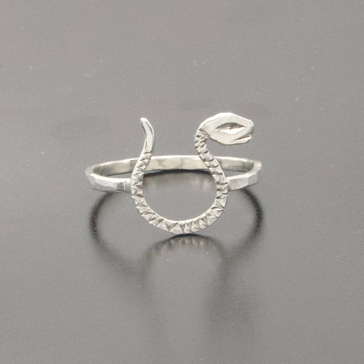 Our Lucky Snake Ring has a hand carved snake and facetted band. Available in 10K Gold or Sterling Silver or 10K snake and blackened silver band.
