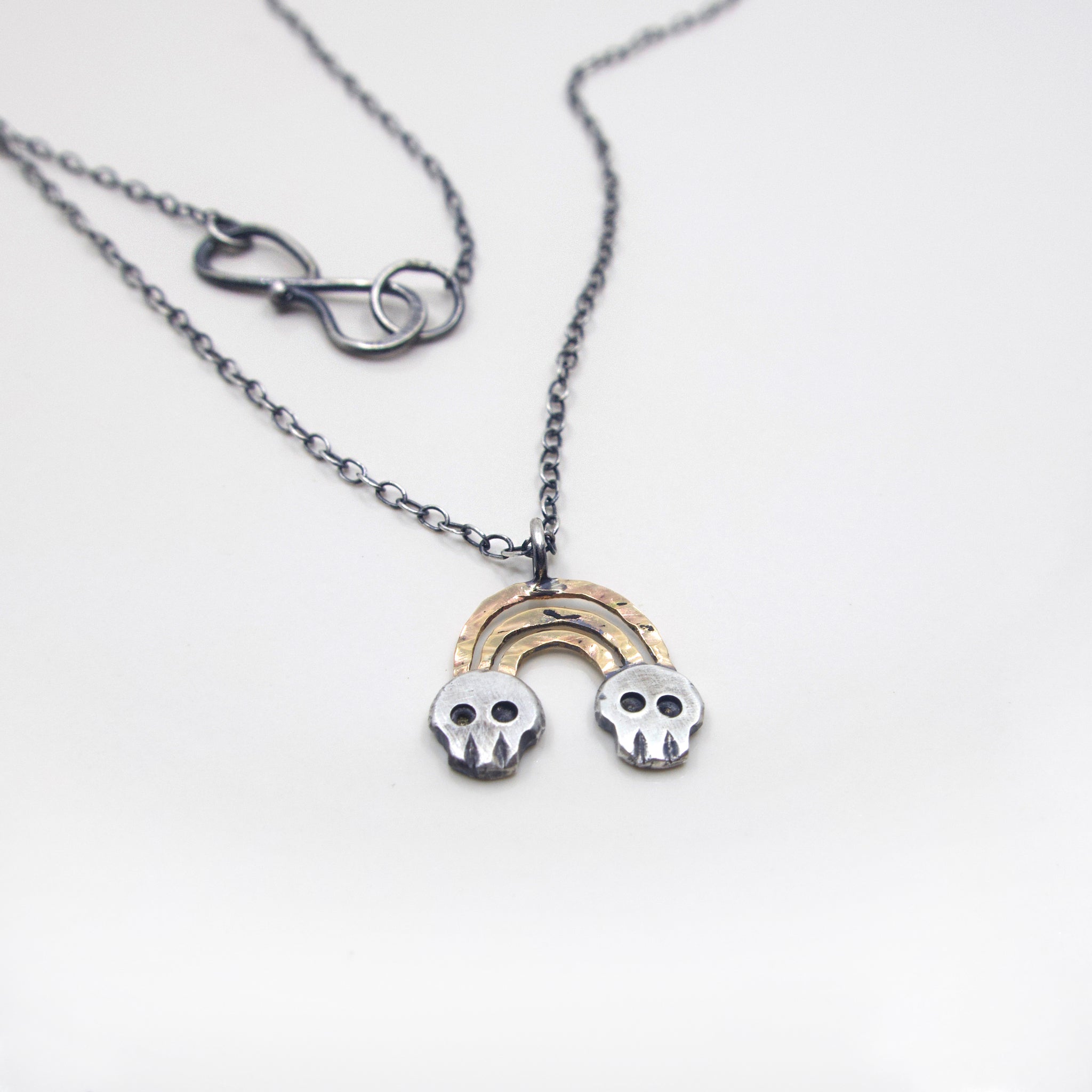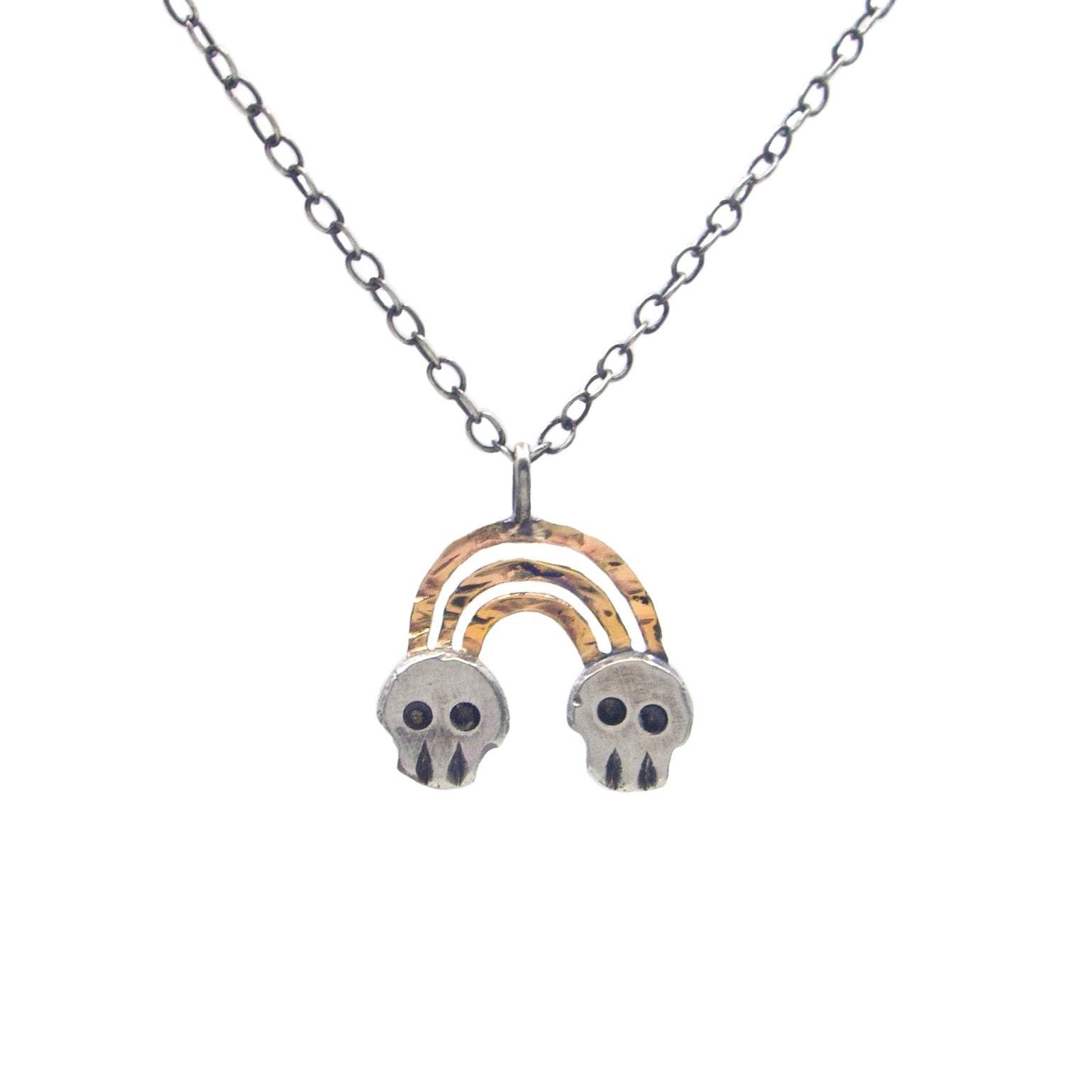 Our Rainbow Skull Necklace features two hand carved little skulls connected by arches of textured wire. Available in brightly finished solid Sterling Silver or in mixed 10K Gold and Sterling silver with an antiqued finish. The rainbow skull pendent is set on an 18 to 20" adjustable necklace.