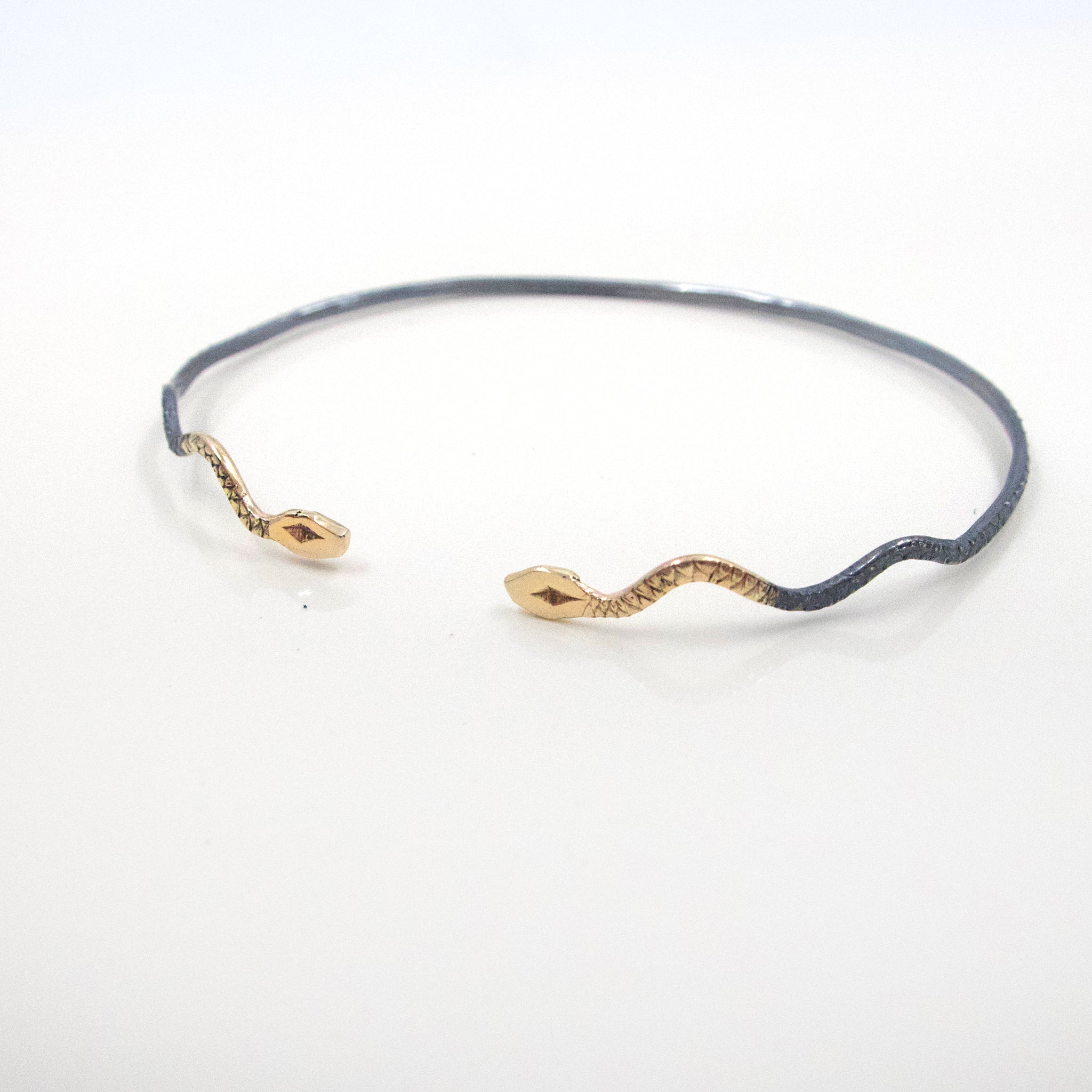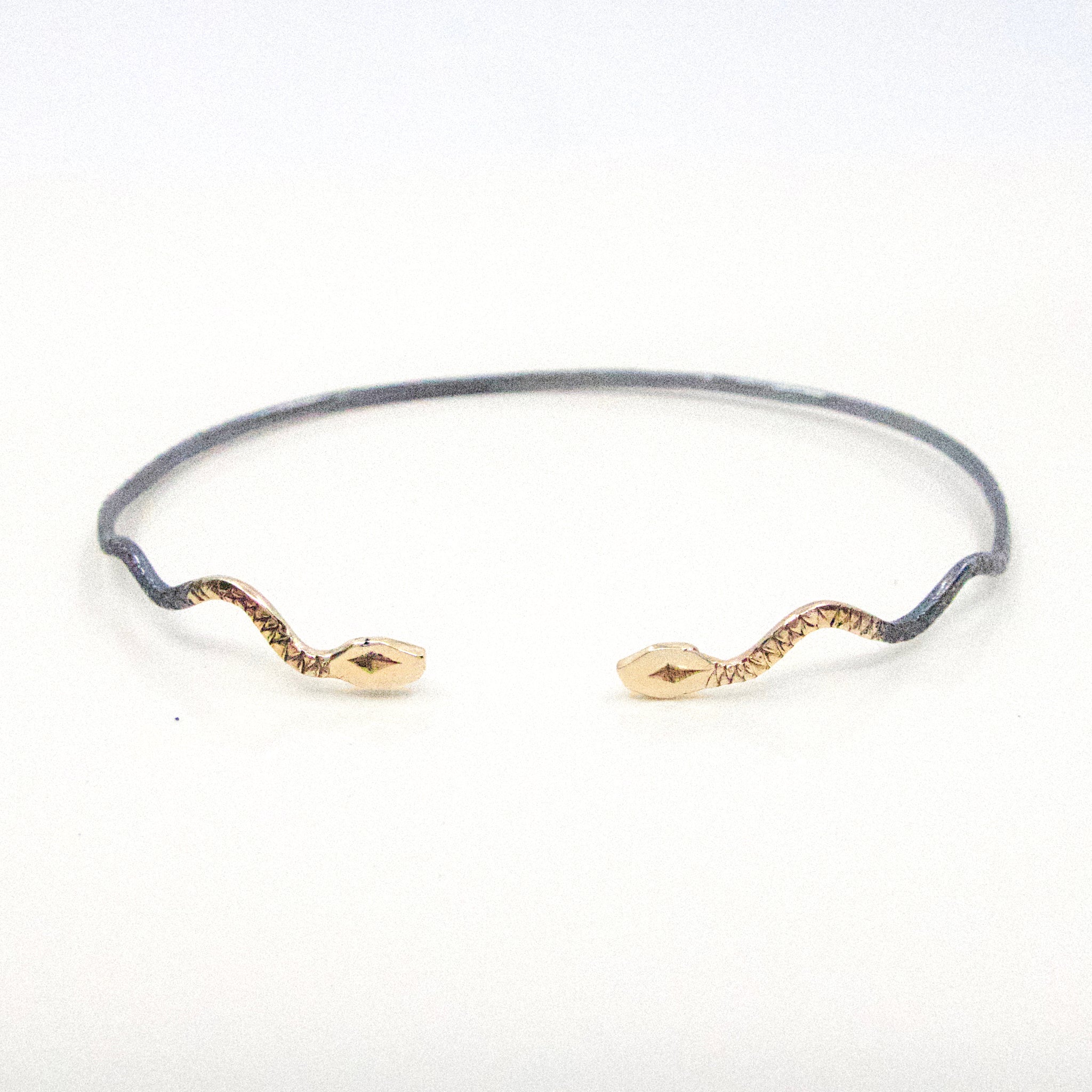 Our Serpent Cuff is a delicate bracelet made with mixed 10K Gold and Sterling Silver with a blackened finish. Its two heads and body are hand carved.